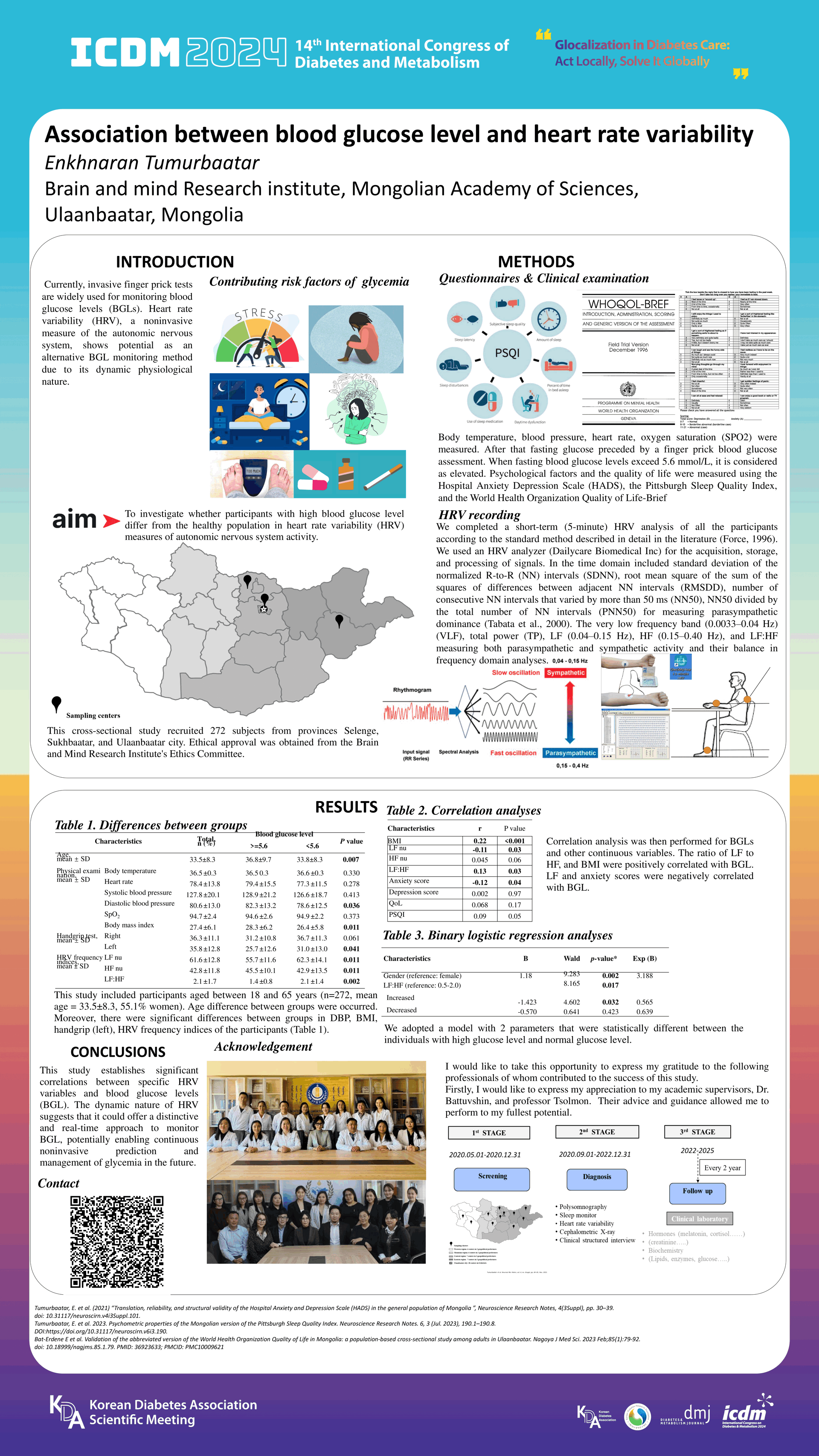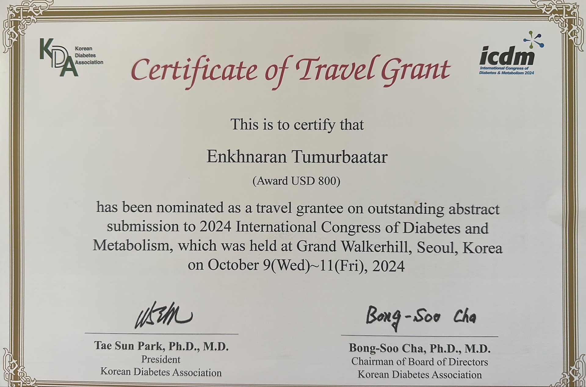 Тархи, сэтгэл судлалын хүрээлэнгийн эрдэм шинжилгээний ажилтан Т.Энхнаран “14th International Congress of Diabetes and Metabolism”-д оролцон “Association between blood glucose level and heart rate variability” сэдэвт илтгэлээр Грант хүртлээ. Уг хурал нь жил бүр Бүгд Найрамдах Солонгос Улсад зохион байгууллагддаг энэ жил 10 сарын 9-11-ний өдрүүдэд Сөүл хотод зохион байгуулагдсан юм.