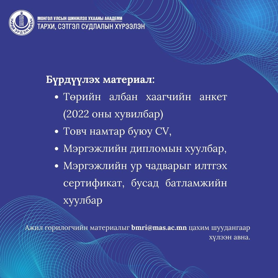 Ажил горилогчийн материалыг 2025 оны 2 сарын 21-ны дотор bmri@mas.ac.mn цахим шуудангаар хүлээн авна.